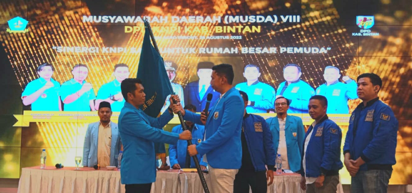Alfeni Menerima Bendera DPD KNPI Bintan dari ketua DPD KNPI Provinsi Kepri, Teddi Nuh
